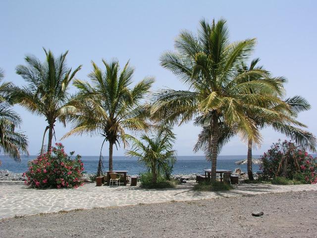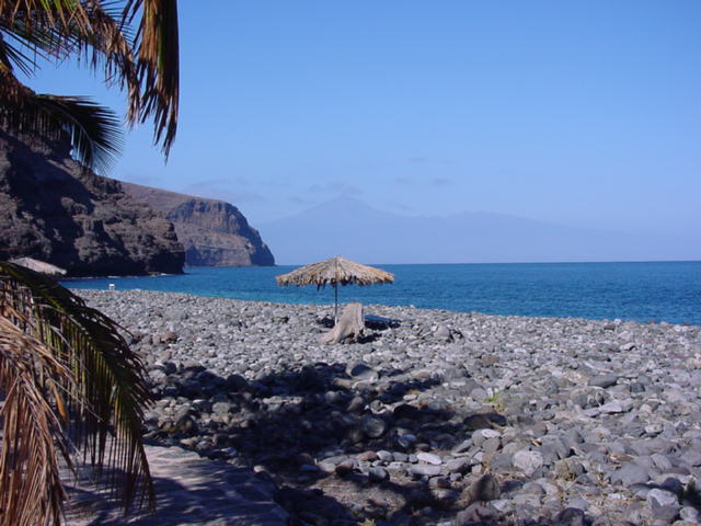 Ganz weit weg und doch wie zum Greifen nah: der Teide. Denn im Gegensatz zu den Bewohnern von Teneriffa können die Gomeros den höchs- ten Berg Spaniens fast immer sehen, und am frühen Morgen bietet er ihnen ein schönes Naturschauspiel mit der aufgehenden Sonne. Der 600m lange Strand der Finca mit Steinen, Kies und schwarzem Sand fällt flach ins Meer ab. Hier findet jeder sein Plätzchen. Es gibt Sonnenschirme und Liegen und ganz bestimmt keinen Liegenterror.